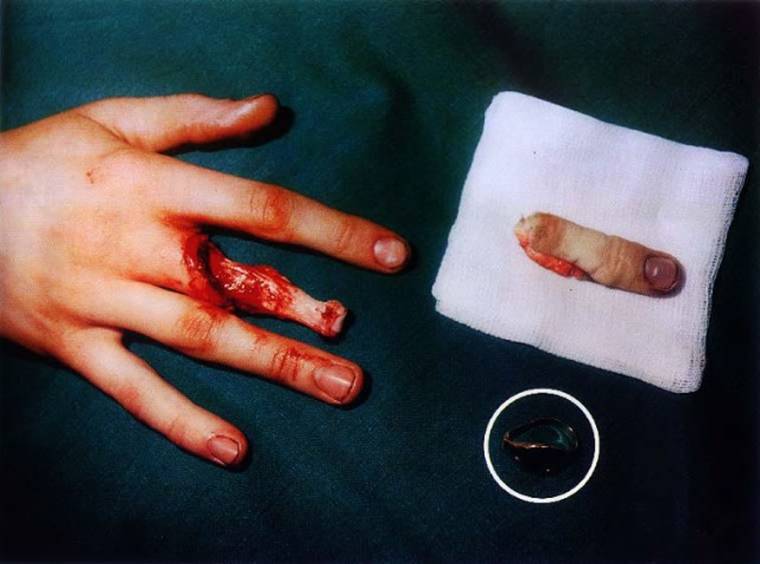 Met het ophangen van een schilderij is er een ongelukje gebeurd. Slachtoffer is met zijn ring blijven hangen, hierbij is het bovenste vingerkootje geamputeerd.